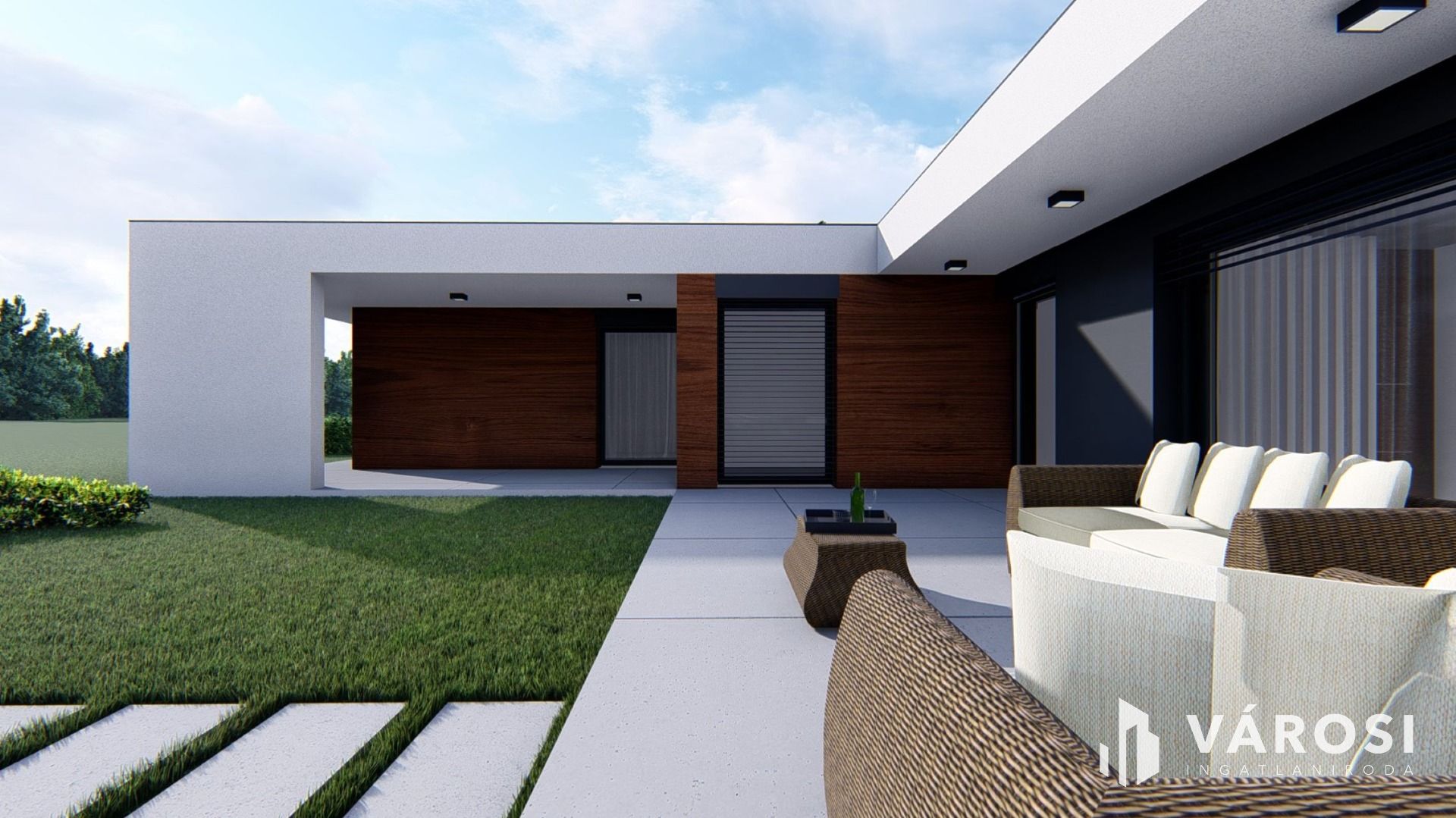 A földszintes, remek elrendezésű, ideális -DNY-i- tájolású nappali+3 hálószobás lakás nettó hasznos lakóterülete 126,29 m2, melyhez összesen 63,61m2 terasz és egy 39 m2 alapterületű dupla gépkocsibeálló tartozik, 585 m2 önálló saját telekrészzel.