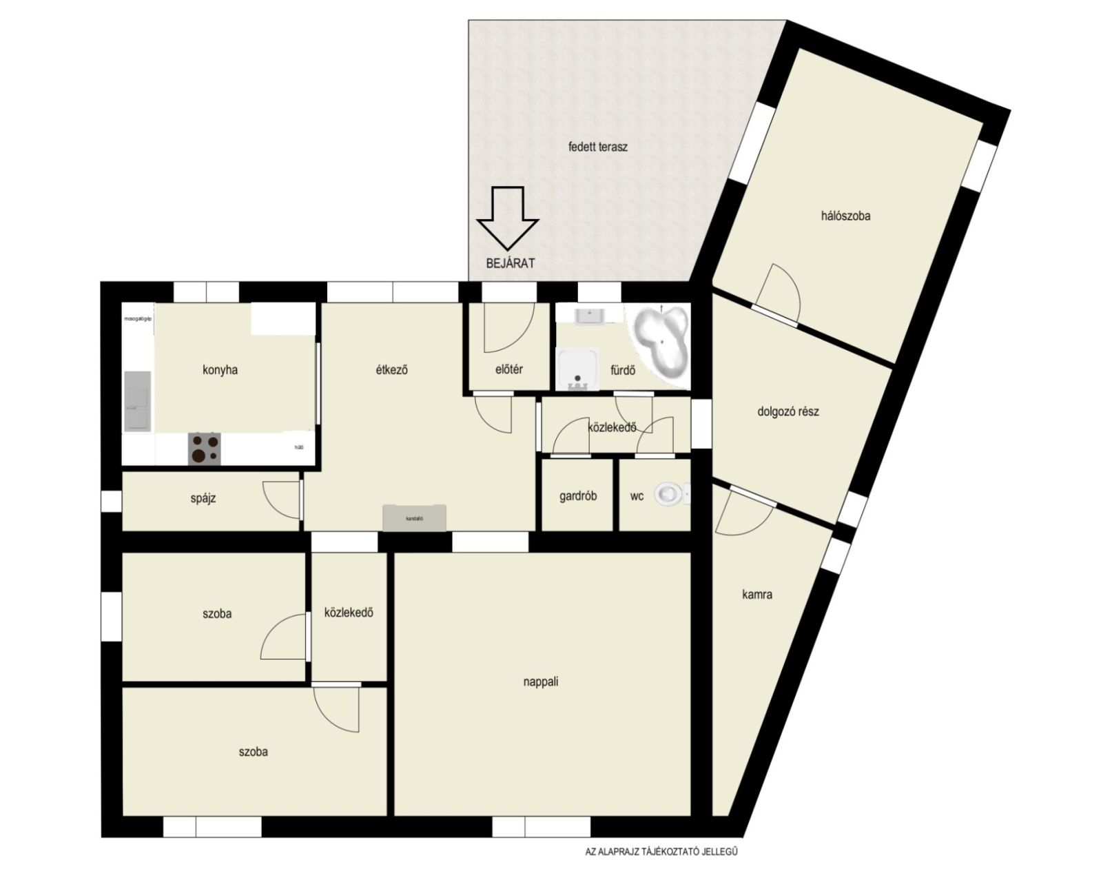 Elosztása szerint: 1 nagy nappali, 3 hálószoba, dolgozósarok, konyha, étkező, gardrób, kamra, kádas-zuhanyzós fürdőszoba, valamint külön WC elrendezésű.