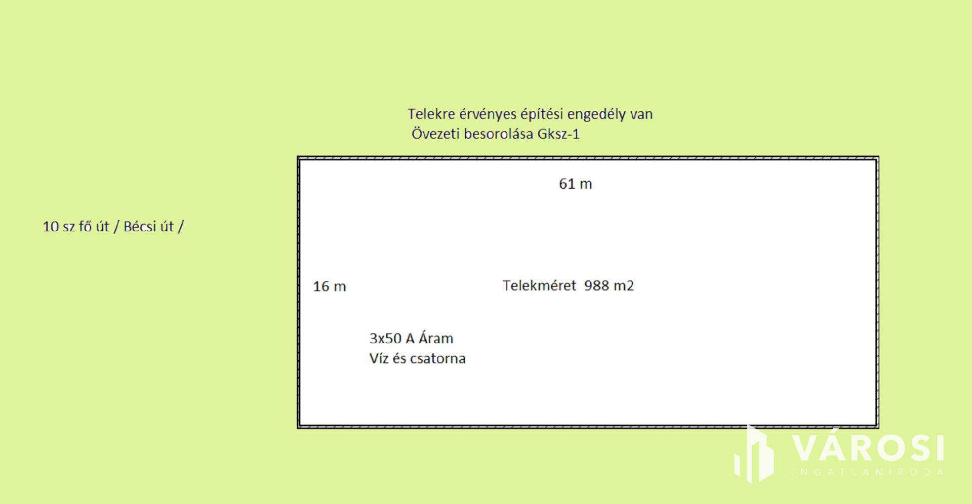 Pilisjászfalu központjában eladó egy 988 m2-es építési telek üzleti, és lakó célra .Ha szeretne befektetni egy jövedelmező ingatlanba, akkor ez a telek Önnek való. Pilisjászfalu központjában, forgalmas helyen található ez a 988 m2-es, viszonylag sík telek, amelyre már van építési engedély és tervrajz is. A telek övezeti besorolása az Gksz-1igy a tervrajz ennek megfelelően készítették el mely gazdasági épület ,szolgáltató ház lenne a funkciója . A tervrajz szerint az alsó szinten üzlethelyiségek, az emeleten pedig szolgálati lakás és iroda lenne kialakítva. A két szint összesen 210 m2 területtel rendelkezne. A telek beépíthetősége és közműellátottsága kiváló. 3x50 A áram lett megigényelve, a csatorna és a víz bekötése folyamatban van. A telek panorámája is szép, a környezete rendezett és barátságos. A településen minden megtalálható, amire szüksége lehet: boltok, iskola, óvoda, orvosi rendelő, posta, stb. A közlekedés is jó, a buszmegálló pár perc sétára van. A telek eladási ára 27 millió forint, amely tartalmazza az építési engedélyt és a tervrajzot is. Ha érdekli Önt ez a remek lehetőség, akkor ne habozz tovább .Kérésre további információkat szívesen biztosítunk. Várom megtisztelő hívását .