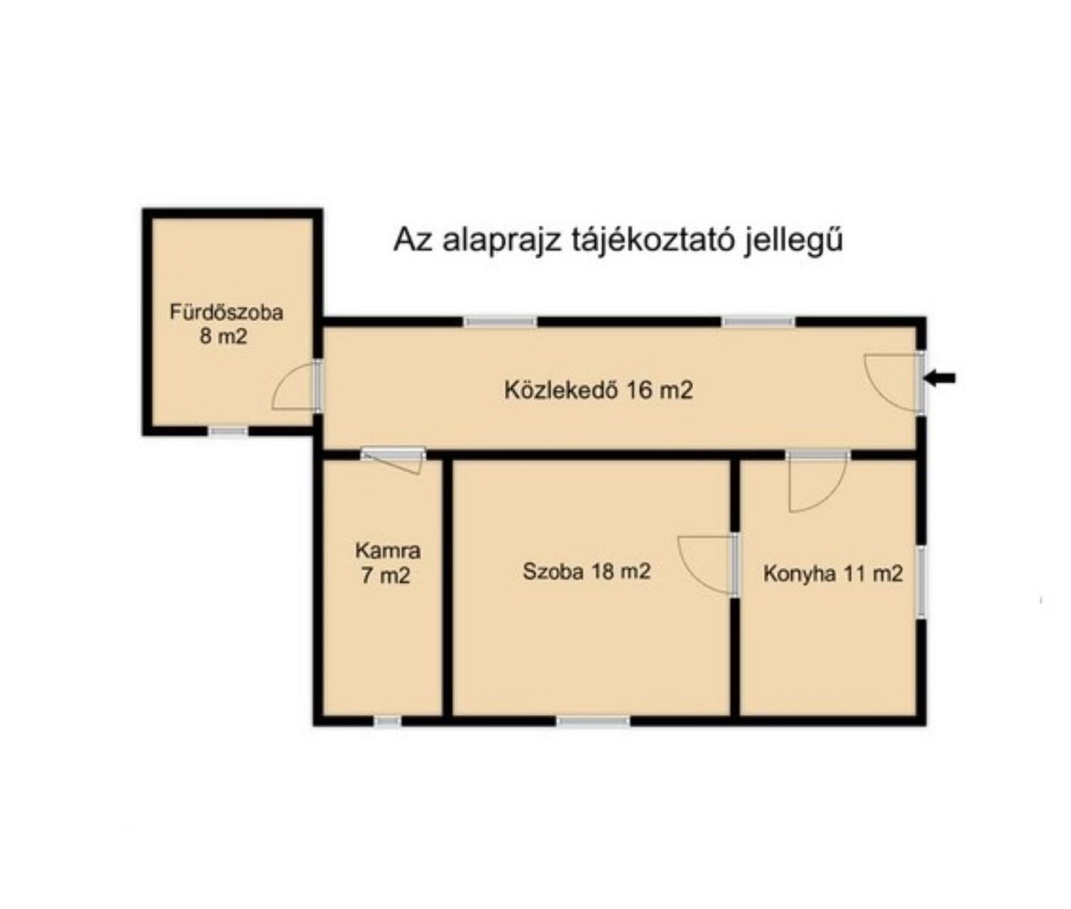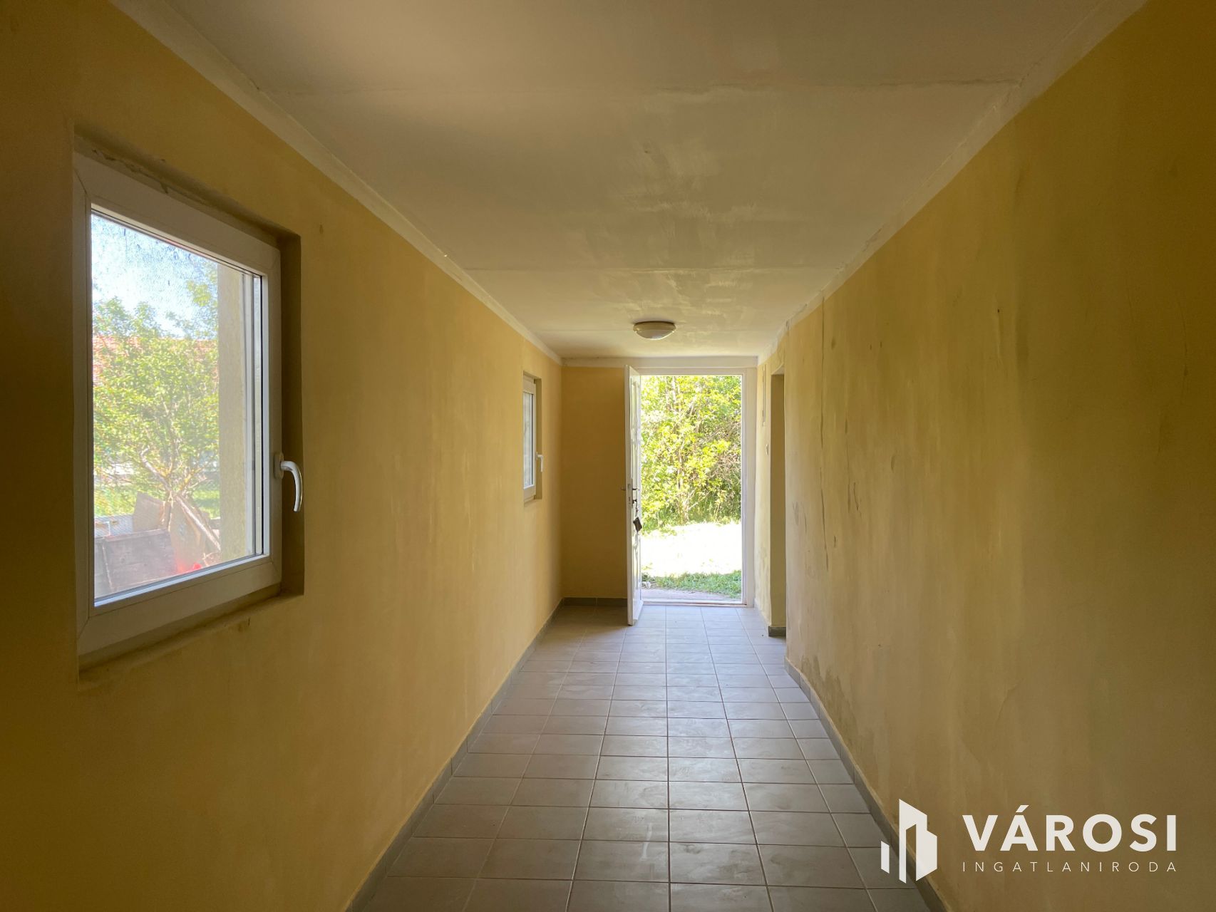 A 60 m2-es házat jelenlegi elosztás szerint egy szoba, konyha, kamra, fürdőszoba és közlekedő alkotja. Viszont az elrendezése lehetővé teszi, hogy praktikusan átalakítható legyen. Így kihozható belőle 2 szoba is és a hosszú széles közlekedő akár egy nappali-konyhaként is szolgálhat. De ha valakinek így ideális, azonnal költözhető, hiszen frissen van festve kívül-belül. Minden helység betonozott, és mindenhol műanyag nyílászárók vannak. Fűtését gázkonvektorok biztosítják és ezen kívül még a mostani konyhában egy cserépkályha is működik. A víz, gáz, villany mellett a csatorna rendszer is kiépítésre került az udvarig.