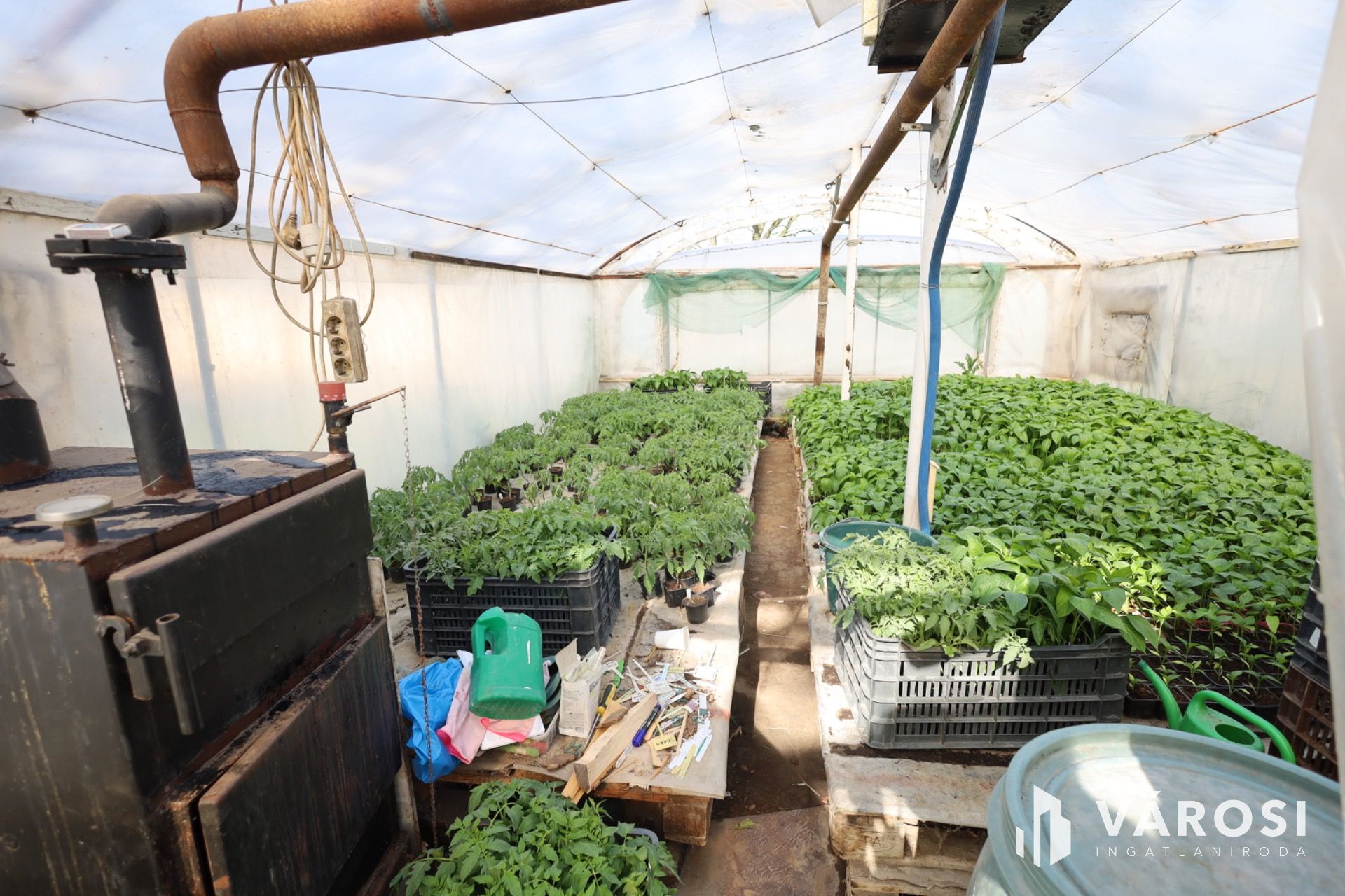 - 600 nm alapterületű, duplavázas, 4,5 m magas, fűthető növényház, kiépített öntöző és csepegtető rendszerrel