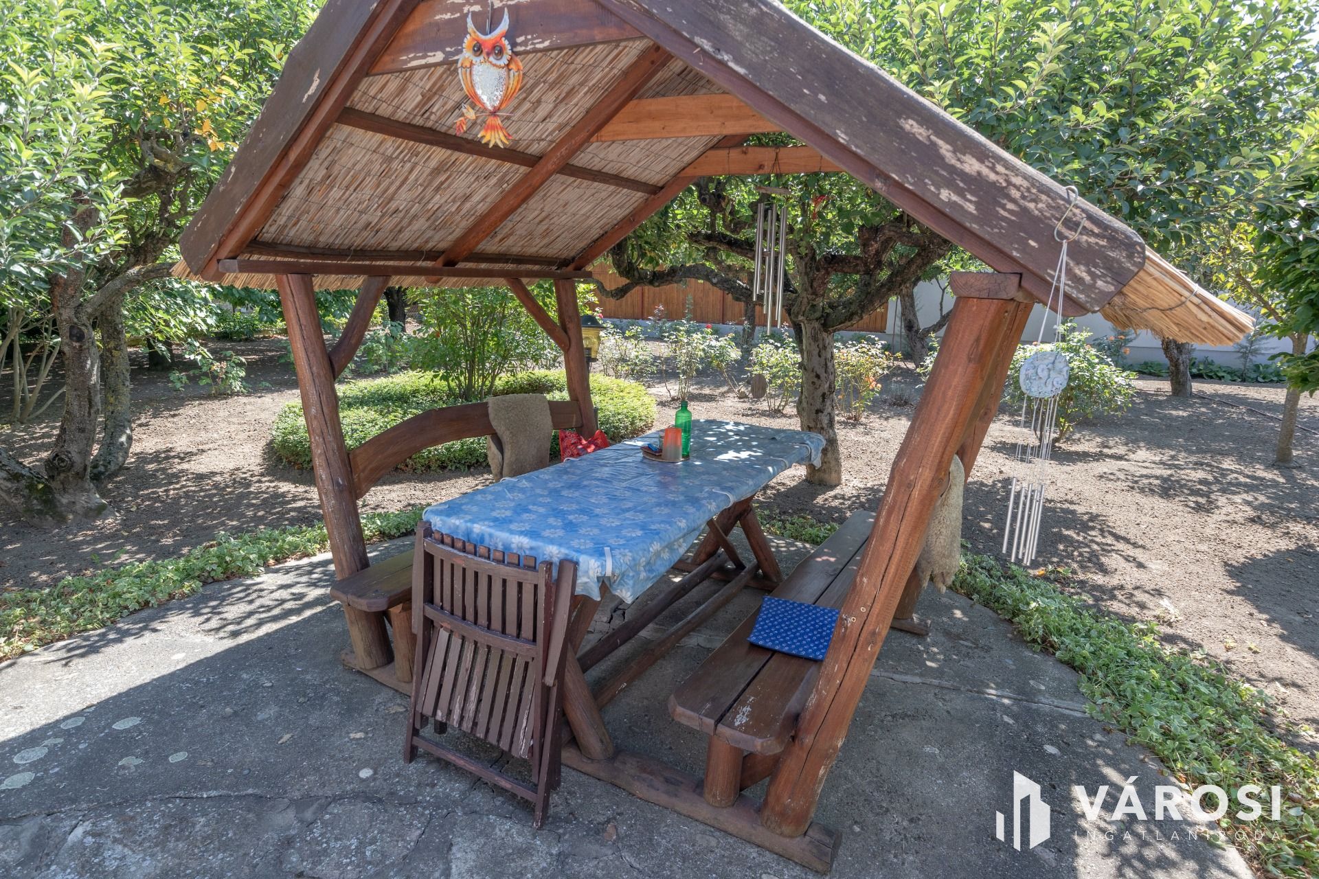 A telken gondozott termő gyümölcsös és dísznövények adnak árnyékot.